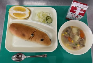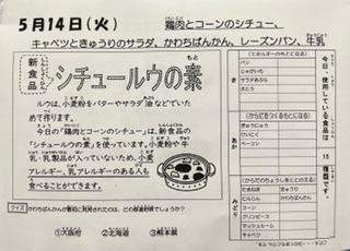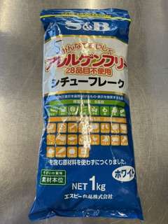 今日の「鶏肉とコーンのシチュー」は、新食品の「シチュールウの素」を使っています。小麦粉や牛乳・乳製品が入っていないため、小麦アレルギー、乳アレルギーのある人も食べることができます。