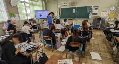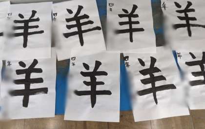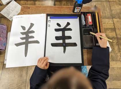 4年生は、毛筆で「羊」と書いていました。画の長さと間隔に気をつけて書いていました。「バランスが難しい」と子どもたち。お手本をよく見て練習していました。