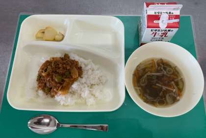 給食では、牛・豚挽き肉とたまねぎを炒めたものに、塩、こしょう、カレー粉、トマトピューレ、ケチャプ、ウスターソースで味付けしています。