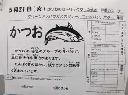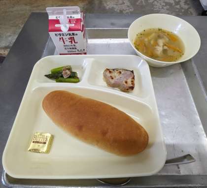 今日の献立は、かつおのガーリックマリネ焼き、押麦のスープ、グリーンアスパラガスのソテー、コッペパン、バター、牛乳です。 かつおのガーリックマリネ焼きは食欲の出る味付けで、好評でした。