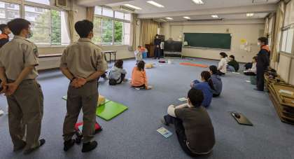 水上消防署の方に来ていただき、教職員対象に救命講習をしていただきました。心臓が止まったときに大切な「AEDの使い方」を含む心肺蘇生法を学ぶ講習です。プール水泳が始まる前に毎年行っています。心肺蘇生法だけでなく、応急処置の仕方なども教えていただきました。
