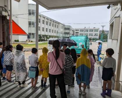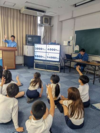 環境事業センターの方が「ごみ減量・リサイクル」の出前授業をしてくださいました。2時間目は、パッカー車が動いているところを見せてもらいました。3時間目は、多目的室で紙芝居を見たり、クイズに答えたりととても楽しく学べました。