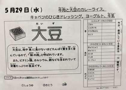 大豆は、肉や魚に負けないほどたんぱく質を多く含んでいるので、「畑の肉」と呼ばれています。また、ビタミン類、カルシウム、鉄などもふくまれていて栄養たっぷりの食品です。