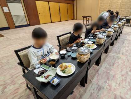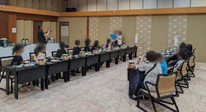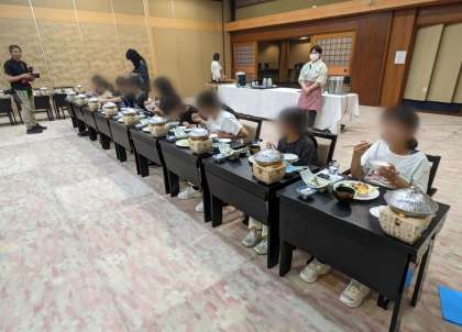 今日はたくさん歩いたので、お腹が空いていたようです。子どもたちは、ご飯や味噌汁のおかわりをし、お腹いっぱい食べました。みんなで食べるとおいしいですね。