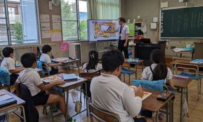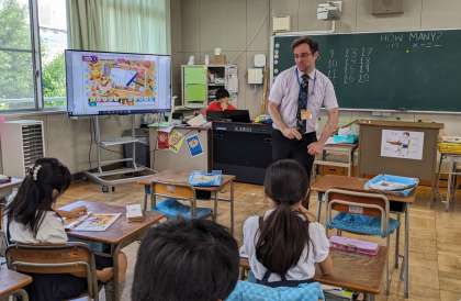 今日はブライアン先生と一緒に学習しました。ボールや消しゴムの数などを英語で数えました。子どもたちは教科書に描かれた鉛筆の絵を「ワン、ツー、スリー・・・、わかった!」と元気よく英語で数えていました。