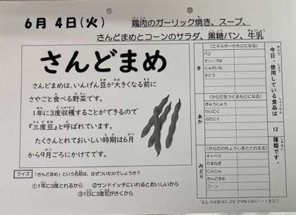 三度豆は、いんげん豆が大きくなる前にさやごと食べる野菜です。旬の三度豆を使用したサラダは甘くて柔らかく、子どもたちにも好評でした。
