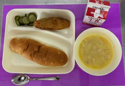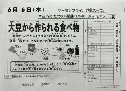 大豆は『畑の肉』と言われているように、体に必要なたんぱく質が多く含まれている食品です。給食の豆乳スープには、たくさんの野菜も入っているので、栄養満点です。