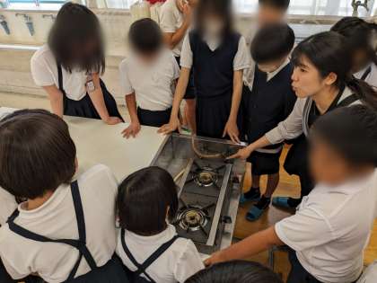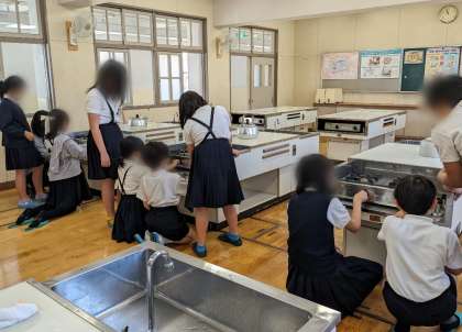 お米の炊き方とガスコンロの使い方を学習しました。家庭科室に入っての学習は初めてで、子どもたちは真剣に先生の話を聞いていました。全員がガス栓を開き、点火つまみを押しながら回し、火をつける練習をしました。強火、中火、弱火にする練習も順番に1人ずつ行いました。弱火にするのが難しく、上手にできた時には、まわりで見ていた友達が自然と拍手をしていました。来週、ご飯を鍋で炊き、お茶を入れる実習をする予定です。