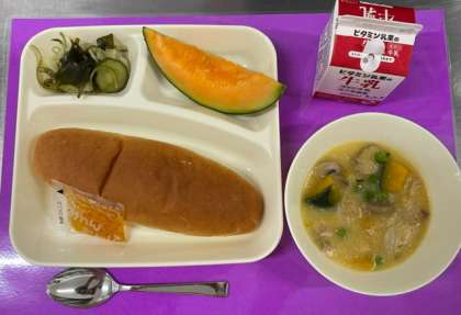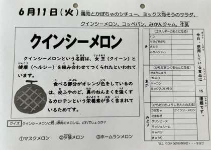 年に1回のクインシーメロンが登場し、みんな喜んで食べていました。みかんジャムも給食で初登場しました。