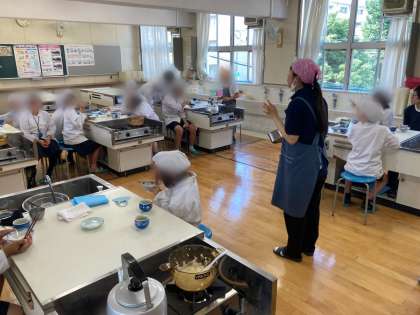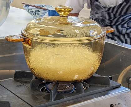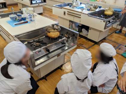 調理実習でご飯を炊きました。ガラス鍋で炊きました。沸騰の状態や水が引いた状態を観察しました。ご飯の味は、「甘くておいしい」「おこげがおいしい」と言っていました。この経験を自然体験学習で生かしたいと思います。