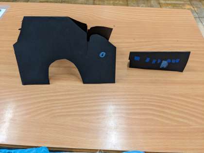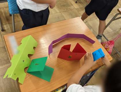 「おって たてたら」 色画用紙を折ったり、切ったり、色を塗ったりしてから立てたら、いろいろな作品が出来上がりました。みんなで鑑賞しました。「すごーい!」という声が聞こえてきました。