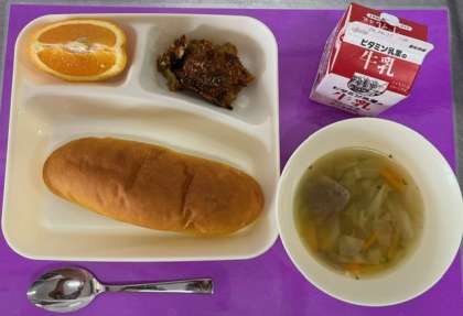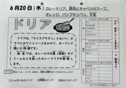 ドリアは、ライスグラタンともいい、ピラフにホワイトソースをかけてオーブンで焼いた料理です。給食では、鶏肉、たまねぎを炒めて米を煮立て、カレールウの素(米粉)やクリームなどで味付けしたものを焼き物機で焼いています。みんなに人気の献立です。