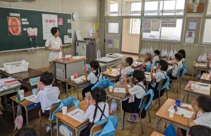 今日は、全学年で歯の健康について学びました。歯科の先生や歯科衛生士の先生に来ていただきました。5年生はDVDで全国歯磨き大会に参加しました。※写真は上から1年生、2年生、3年生です。