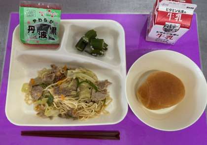 焼きそばは、給食で人気の献立です。今日は和風のしょうゆ味でした。みんな喜んで食べていました。