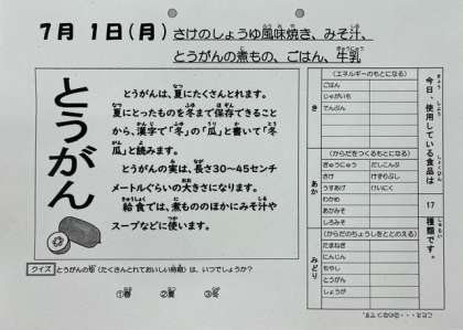 夏が旬の「とうがん」が登場しました。「とうがんの煮物」は、とうがんをしょうがの風味をきかせただしで煮ています。