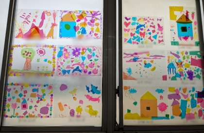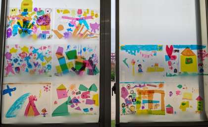 2年生の教室前の廊下の窓に2年生が作った図画工作「ひかりのプレゼント」の作品が掲示されています。とってもきれいです。