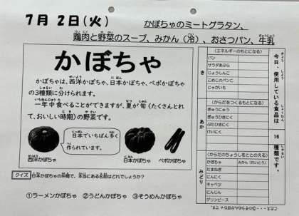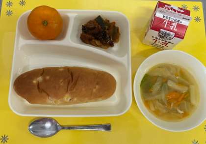 旬のかぼちゃを使用したミートグラタンは、甘みもあり大好評でした。今年度初めて登場した冷凍みかんは、1年生は「アイスだぁ〜」と喜んでいました。