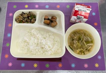 「高野どうふのいり煮」は、豚ひき肉とだしの旨みを粉末の高野どうふに含ませて仕上げます。にんじん、ひじき、彩りにグリピースを加えています。一年生からも、「食べたらめっちゃおいしい〜」と喜んで食べていました。
