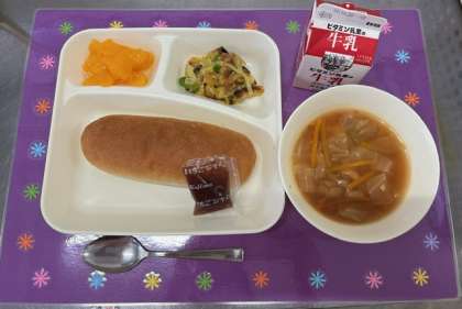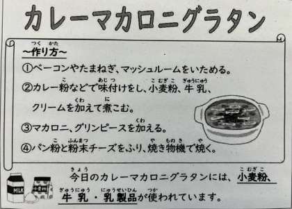 今日の献立は、児童がとても喜ぶ献立でした。「カレーマカロニグラタンおいしい〜」と、とても喜んで食べていました。
