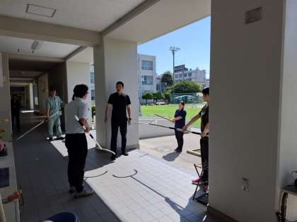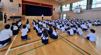 港警察の方に不審者役をしていただき、教職員で不審者の対応をしました。不審者だと思った時点ですぐに警察に通報。児童と教職員には放送で不審者がいることを伝え避難。安全を確認してから全学年が講堂に集合しました。学校長からは不審者を見分ける合言葉「は ち み つ じま ん」の話がありました。
