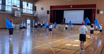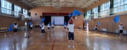 5年生がフラッグを使って初めて練習をしました。動きをまだ覚えていませんが、子どもたちはとても意欲的です。「難しいけれどなんとかできそう」と子どもたち。保冷剤で身体を冷やしたり、水分補給したり休憩しながら練習をしました。
