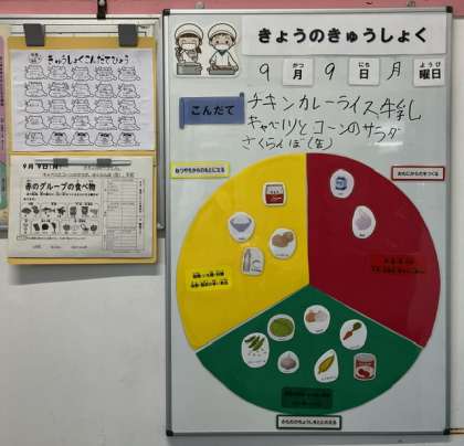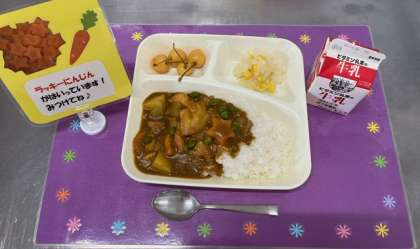 今日は、児童に大人気のカレーライスでした。「ラッキーにんじんが入ってたぁ〜」と喜んで食べていました。