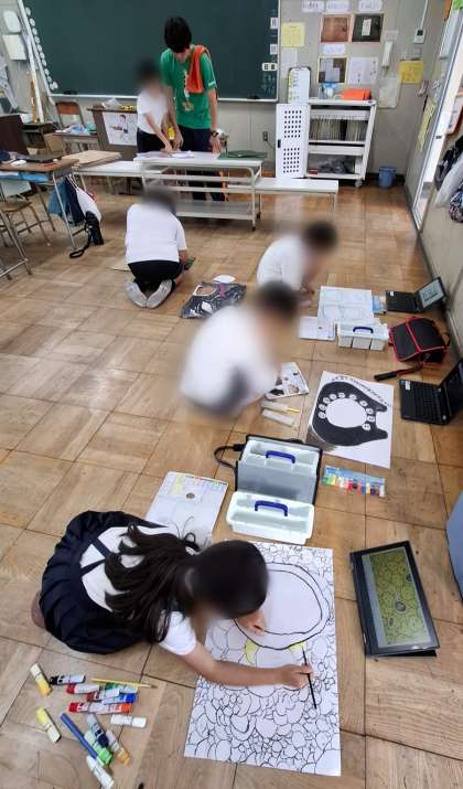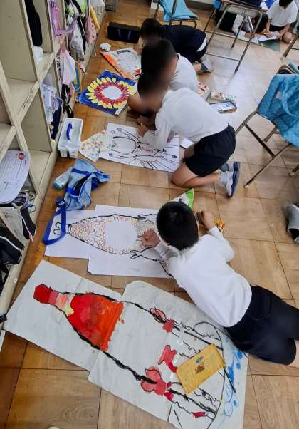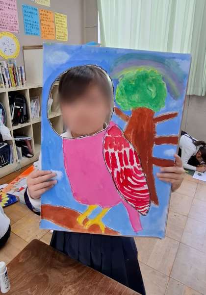 顔出しパネルを作っていました。どんな絵から顔を出すか考えてから、絵の具で色を丁寧に塗っていました。みんな違ってみんなよかったです。出来上がった作品の穴から顔を出すのが楽しみですね。