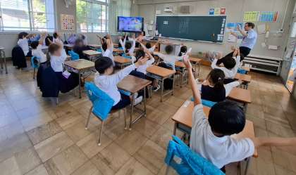今日はブライアン先生に英語を教わりました。始めに、担任の先生と英語の歌を5、6曲歌いました。子どもたちは皆、とても元気いっぱいの声で英語の歌を歌いました。体も動かして歌うこともあり、とても素晴らしかったです。