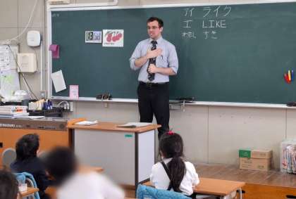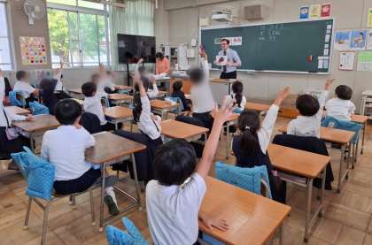 ブライアン先生とは果物の名前を使って「私はリンゴが好きです」と英語での言い方を習いました。1年生はとても元気いっぱいの声で発音の練習をしていました。