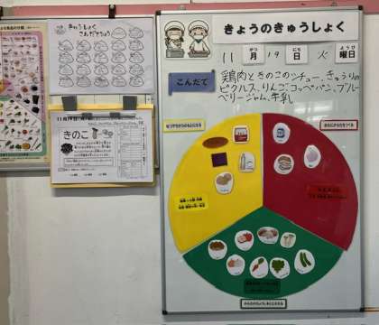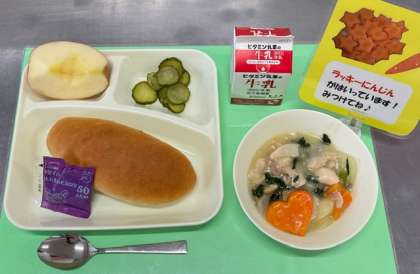 きのこは、おなかの調子を整える働きがある食物繊維や、骨や歯をじょうぶにするために必要なビタミンDなどの栄養素を多く含んでいます。今日の「鶏肉ときのこのシチュー」には、しめじ、エリンギ、マッシュルームを使っています。