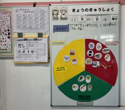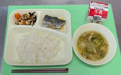 だしは、食品に含まれる「旨味」の成分を水で煮出したもので、和食には欠かせないものです。今日の給食のすまし汁と大豆の煮ものには、けずりぶし(さばぶしとにぼしを混ぜたもの)とこんぶでとっただしを使っています。
