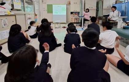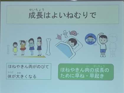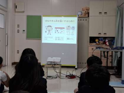 測定の前に「体が動く仕組み」について、保健室の先生から話を聞きました。骨の数は赤ちゃんの時は300個ほどで、大人になるといくつかの骨が引っ付くので206個になると知りました。成長痛がおきる原因についても知ることができました。5年生の子どもたちは集中して話を聞くことができ素晴らしかったです。