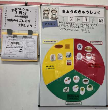 牛乳には、骨や歯をじょうぶにするカルシウム、筋肉や血を作るたんぱく質のほか、ビタミン類などが含まれています。主に体を作るもとになる赤のグループの食品です。