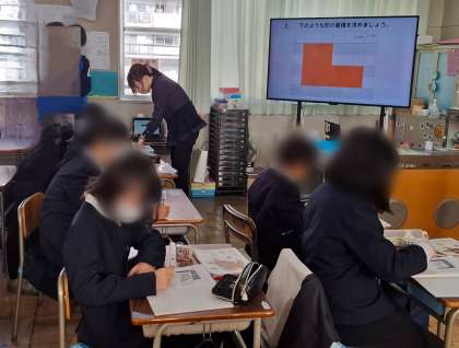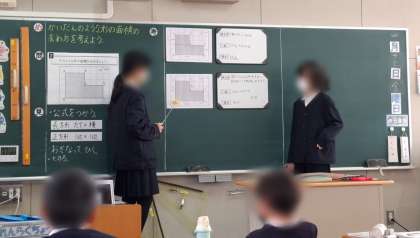 4年生は、階段のような図形の面積の求め方を考えました。長方形になるように切ったり、欠けている部分を補って長方形にしてから補った部分を引いて求めたりしました。友達の考えを聞いたり、自分の考えを友達に伝えたりすることでいろいろな考え方があることがわかりました。自分の考えをわかりやすく説明することができ素晴らしかったです。