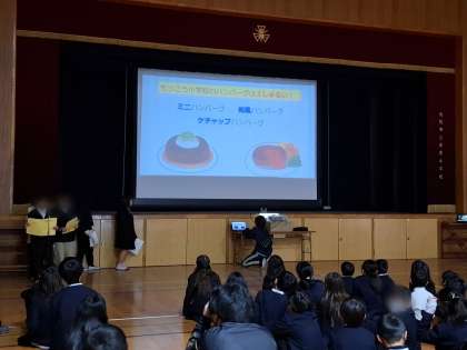 今日は給食委員会の発表です。はじめに給食に関するクイズをしました。給食に出てくるハンバーグやカレーは何種類あるかが問題に出されました。カレーは10種類もあることがわかりました。食べ物クイズでは、いちご入りのカレーが販売されていることを知り、子どもたちはびっくりしていました。栄養のクイズでは、赤色の食べ物(主に体をつくるもとになる食品)はマヨネーズか豆腐かいちごのどれでしょうかという問題が出ました。答えは豆腐でした。赤色の食べ物ということで、いちごと思っていたのに、白い豆腐だとわかり、意味を考えていなかったと気づいていました。そして、最後に給食調理員さんに一人一人が書いた手紙を渡しました。いつもおいしい給食を作ってくださり、ありがとうございます。