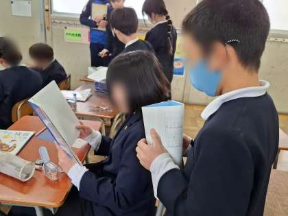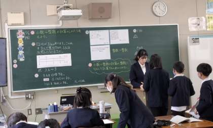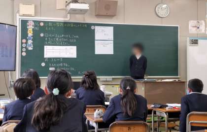 4年生は小数÷整数の学習をしました。自分の考えをペアで説明し合ったり、全体で伝え合ったりしました。最後に練習問題やチャレンジ問題をしたのですが、子どもたちはとても集中して計算していました。チャイムがなっても最後まで解きたいと計算していました。