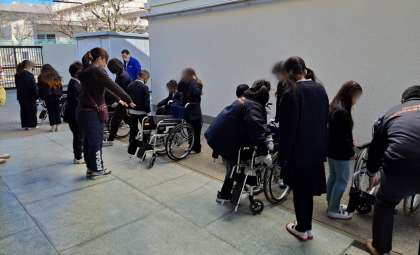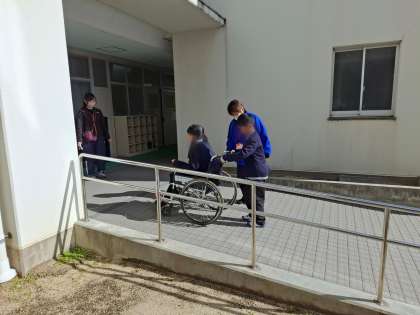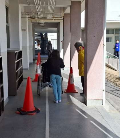 出発する時や曲がる時など声をかけることが大事だと教えていただきました。4年生は慎重に車椅子を押していました。