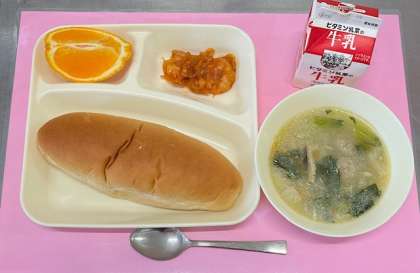 給食の中華がゆは、米のほかに肉だんご、チンゲンサイ、だいこん、にんじん、しいたけが入っています。