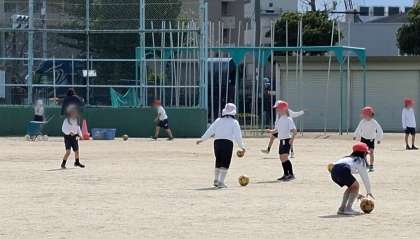 2年生は運動場でボール蹴り遊びをしていました。友達にボールを蹴ってパスをしたり、シュートをしたり、元気一杯体を動かしていました。