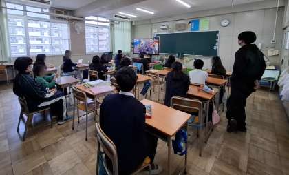 担任から子どもたちへのサプライズ。2年間の思い出を写真や動画で振り返りました。子どもたちは「懐かしい」「この調理実習で作ったのが一番おいしかった」など思わず声に出していました。