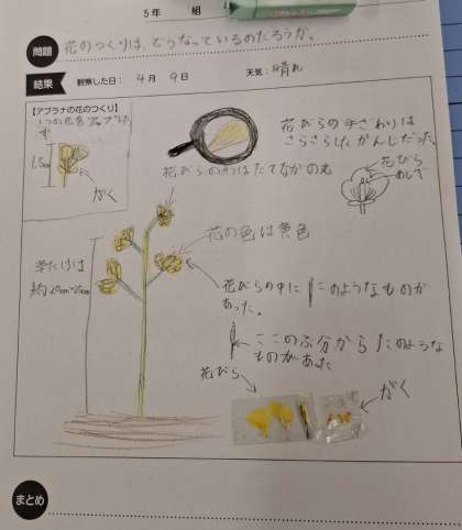 5年生は花のつくりの学習をしていました。学習園に育つ菜の花を観察し、おしべやめしべ、がくなどを観察カードに書き込みました。5年生は観察してわかったことを丁寧にかいていました。