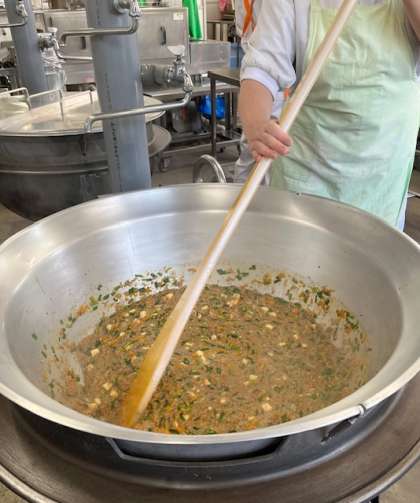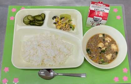 マーボーどうふは、中国の四川料理の代表的な料理です。とうがらしみそを使うのが特徴です。給食では、赤みそやしょうゆなどで味付けし、トウバンジャンで辛味を付けています。