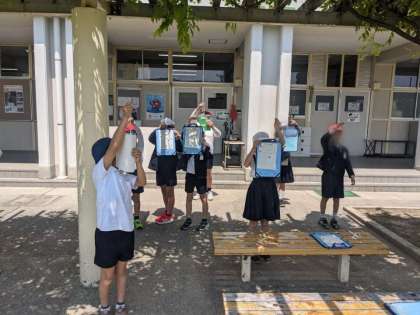 晴れの日の1日の気温の変化はどのようになっているのかを予想してから、1時間ごとに温度計で気温を測りに行きました。