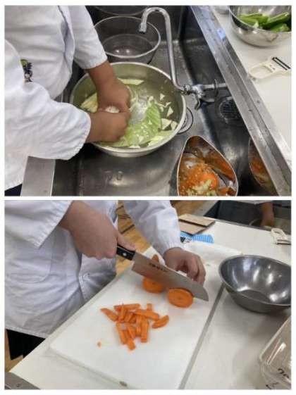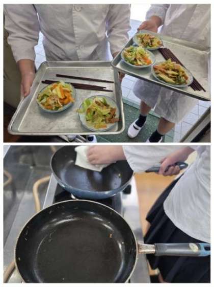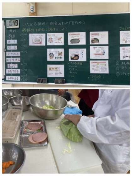 家庭科の調理実習で、「いろどりいため」という野菜炒めを作りました。