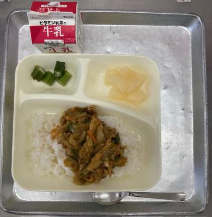 「和風カレー丼」は、けずりぶしのだしの風味をきかせた和風のカレーをご飯にかけて食べる、児童に好評な献立です。