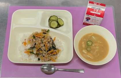 豚ひき肉とにらのそぼろ丼、みそ汁