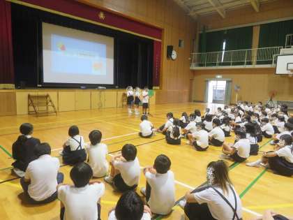 校歌Remixを歌い、「1学期を振り返って」3年生と5年生の代表が作文を読みました。