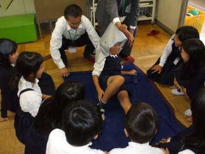 (財)大阪建築防災センターの方に来ていただき防災についての学習をしました。災害が起こったときに必要なものや安全に避難するための工夫など詳しく教えていただきました。