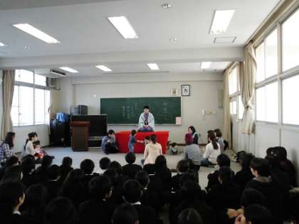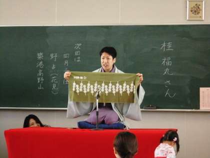 落語家の桂福丸さんが来られました。1〜2歳位のお子さんが、元気よく走り回っている中、お話をしてくださいました。また、手ぬぐいをいろいろな物に見立てて披露してくださいました。手ぬぐいを焼き芋に見立てて熱そうに食べるさまを見せていただき、本当にあつあつのお芋を食べているようでした。また、「動物園」という落語を聞かせていただきました。落語の楽しを知ることができ、とてもよかったです。