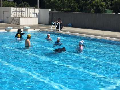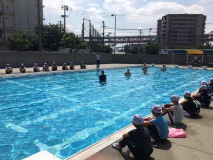 服を着たまま水の中に入るとどのようになるのかを体験したり、おぼれてしまった時に使える身近な道具などの話を聞いたりしました。